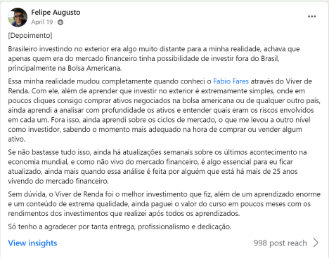 Monitor do curso "Viver de Renda" de Bruno Perini desde a 12ª turma e professor do módulo "Investimento no Exterior" desde a 14ª turma, curso que atualmente está na 21ª turma. Já ensinou sobre investimentos no exterior para mais de 12 mil alunos.